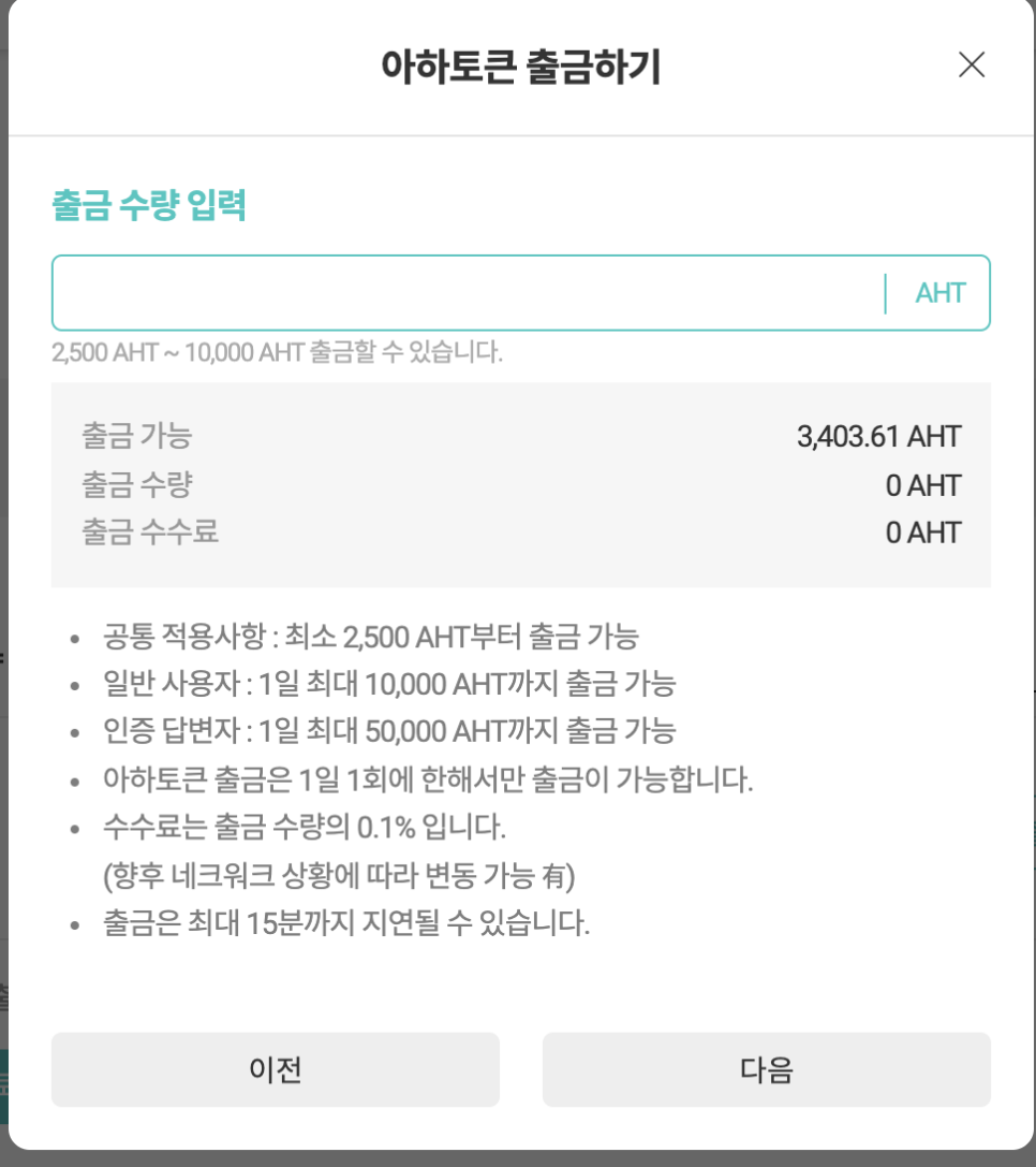 벌써?! 2500 아하토큰이 생겨서 빗썸으로 출금해보았습니다