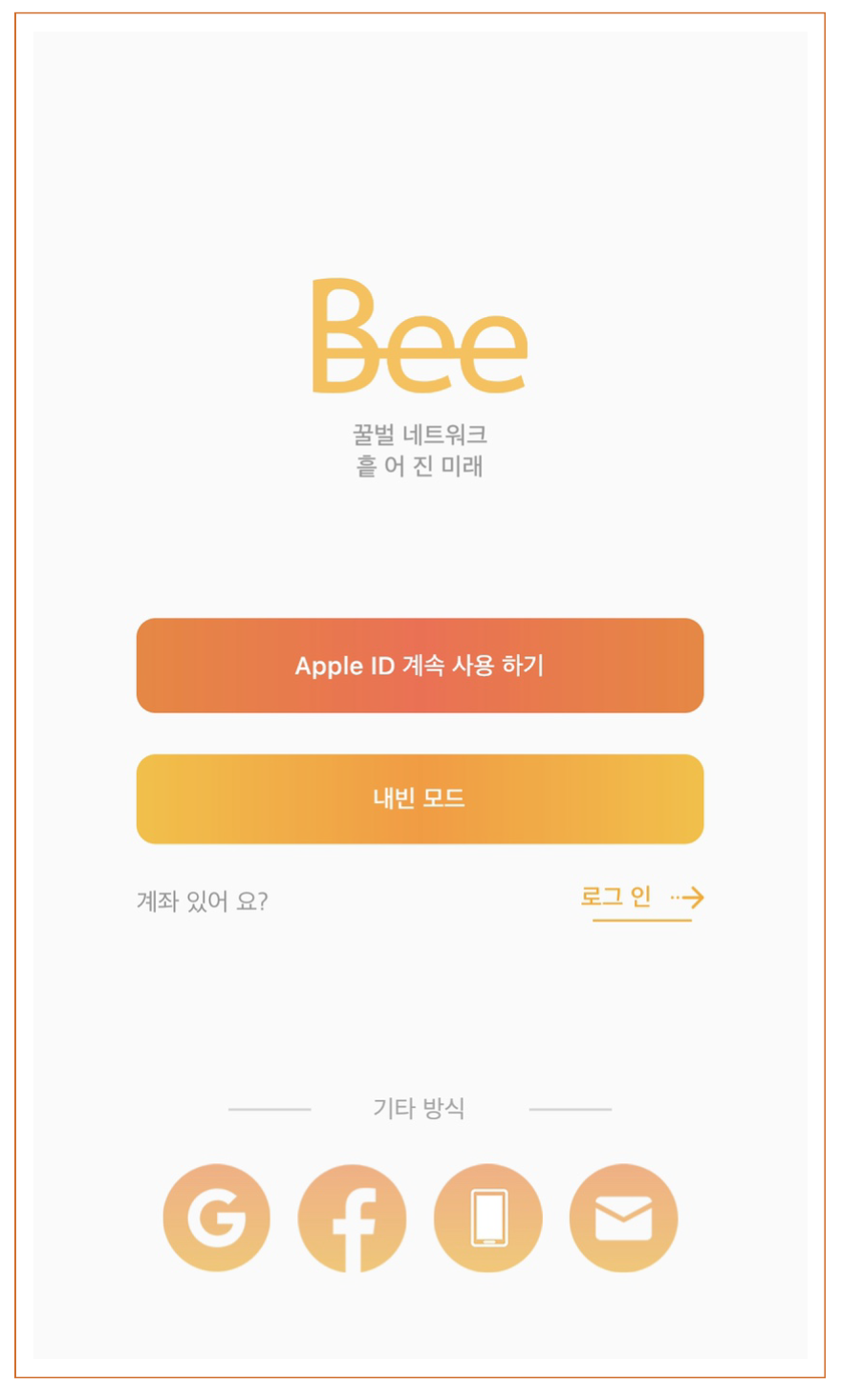 우선 앱을 다운받습니다. 앱스토어나 구글플레이에 들어가 Bee라고 검색하면 Bee Network / Bee.com 라는 이름에 위와 같은 앱을 찾으실 수 있습니다. 앱을 다운받고 실행시키면 Apple ID 계속 사용하기 / 내빈 모드라고 있습니다. 아직 번역이 완벽하게 이뤄지지 않은 모습이네요.