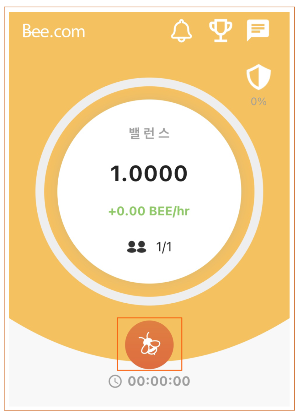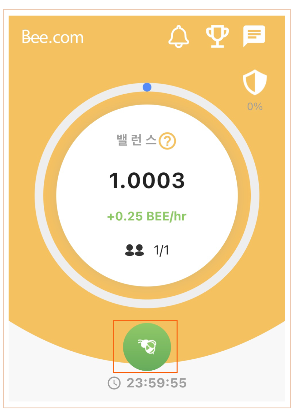 추천인코드까지 입력하면 위와 같은 화면으로 넘어갑니다. 주황색의 멈춰있는 벌을 터치해주면 녹색으로 바뀌고 벌이 움직이기 시작하면서 비코인 채굴이 시작됩니다.